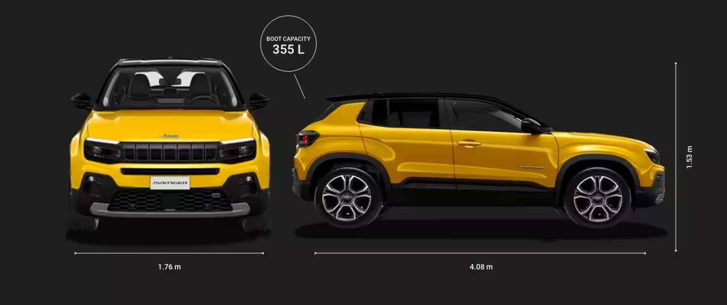 Jaunais Jeep Avenger piedāvā komfortu un plašumu, kas Jums nepieciešams katrā braucienā, tostarp ekstrēmākajos piedzīvojumos. Izmēru ziņā jaunais Jeep Avenger ir līdz 1,53 m augsts, savukārt tā garums ir 4,08 m, bet platums – 1,72 m.
